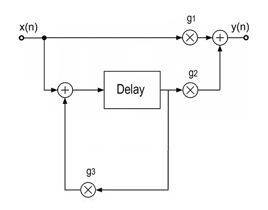 wobei x(t) das Eingangssignal, τ die Verzögerungszeit und g (hier g3) der Feedback-Faktor ist.