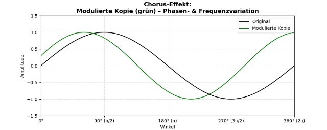 Durch die Kombination von Original- und Effektsignal kommt es zu Phaseninterferenzen: Je nach Phasenlage werden bestimmte Frequenzanteile verstĂ€rkt, andere abgeschwĂ€cht. Da sich diese Phasenbeziehungen durch die laufende Modulation stĂ€ndig Ă€ndern, entsteht ein lebendiger, sich bewegender Klang mit charakteristischem Schimmern. In der Musikproduktion wird der Chorus-Effekt gezielt eingesetzt, um Instrumente wie Gitarren, Synthesizer oder Gesang voller, breiter und âgröĂerâ klingen zu lassen.