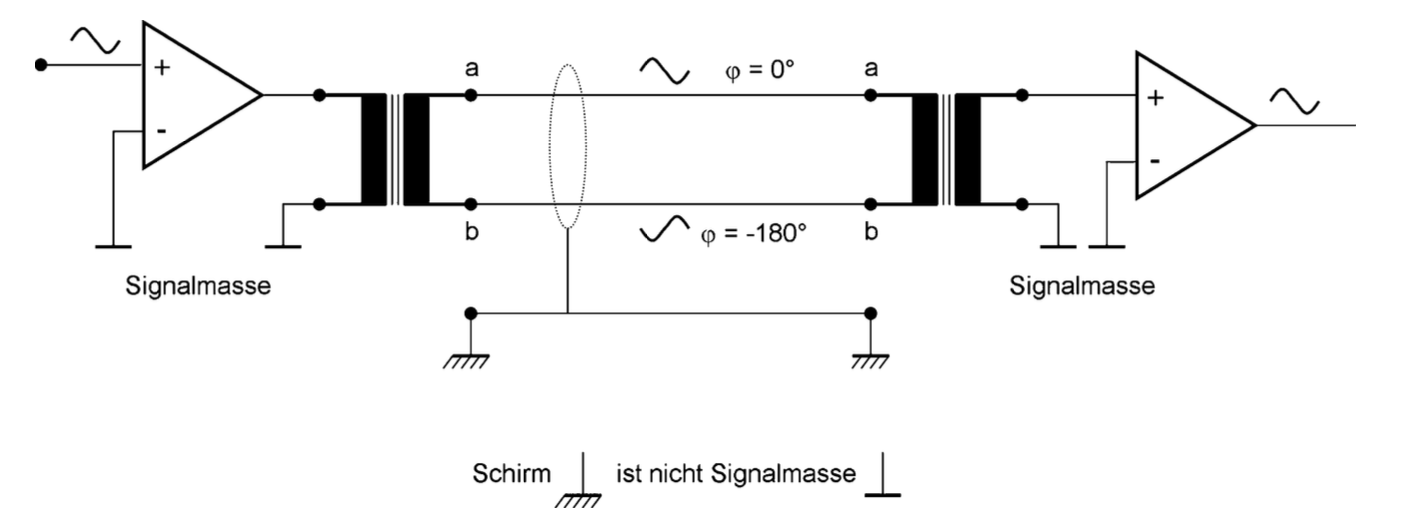 Abb. 3: De-/symmetrierung mit Übertrager Gegenüber elektronischen Varianten weisen Übertrager zwei Vorteile auf. Zum einen wird bei Übertragern eine hohe Gleichtaktunterdrückung erzielt und zum anderen sind Quelle und Senke galvanisch voneinander getrennt, wodurch keine leitende Verbindung zwischen beiden Seiten besteht und Brummstörungen vermieden werden. Nachteile treten bei einfachen oder zu klein dimensionierten Übertragern auf. Bei tiefen Frequenzen und hohen Spannungen kann der ferromagnetische Kern in die Sättigung geraten, was zu Verzerrungen (höherer Klirrfaktor), unerwünschter Kompression und Frequenzgangabweichungen führt.[Slavik]