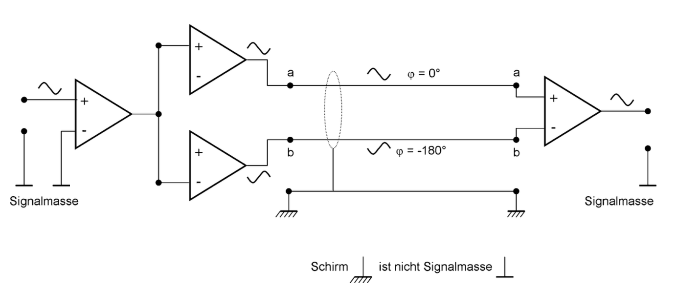 Da hochwertige Übertrager teuer sind, verwenden viele professionelle Geräte stattdessen Operations- oder Differenzverstärker zur Desymmetrierung von Audiosignalen. Diese arbeiten dann besonders gut, wenn die Quelle niederohmig und die Senke hochohmig ist, also eine Spannungsanpassung von etwa 1:100 bis 1:1000 vorliegt.[Slavik] Ein Operationsverstärker (OPV) ist ein aktives Bauelement, das zwei Eingangsspannungen vergleicht und nur aus gegenphasigen Signalanteilen in eine verstärkte Ausgangsspannung erzeugt.[Meitinger] Die Schaltung des Differenzverstärkers ist die Grundschaltung des Operationsverstärkers.[wiki]