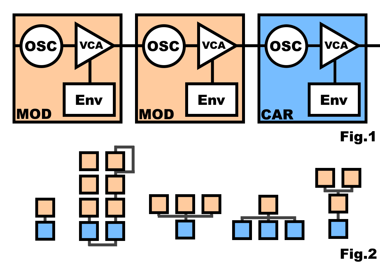 Fig. 1 beschreibt zwei Modulatoren, die in Kaskade geschaltet auf einen Träger einwirken. Häufig werden Envelope-Generatoren verwendet (ADSR), um die Modulation zeitlich abhängig zu machen: So erhält man z.B. einen obertonreichen Anschlag, der dann in seinen reinen Grundton übergeht. Fig. 2 beschreibt verschiedene Operationsprozesse. Von links nach rechts: