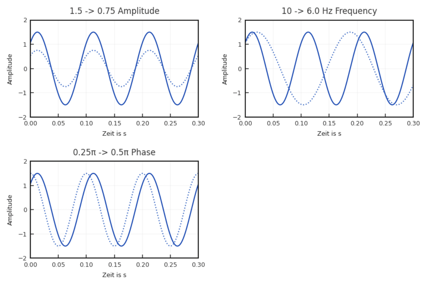 Die Kreisfrequenz \omega setzt sich dabei aus \omega = 2 \pi f zusammen, wobei f die eigentliche Frequenz in Hertz ( 1 Hz = 1 s^{-1}) darstellt. Sie gibt an, wie viele Perioden einer Schwingung in einer Sekunde Signal vorhanden sind, daher s^{-1} = pro Sekunde als Maßeinheit. Um die anderen Parameter etwas zu verdeutlichen, sind in Abbildung 2.12 Sinustöne mit variierenden Parametern gezeigt.