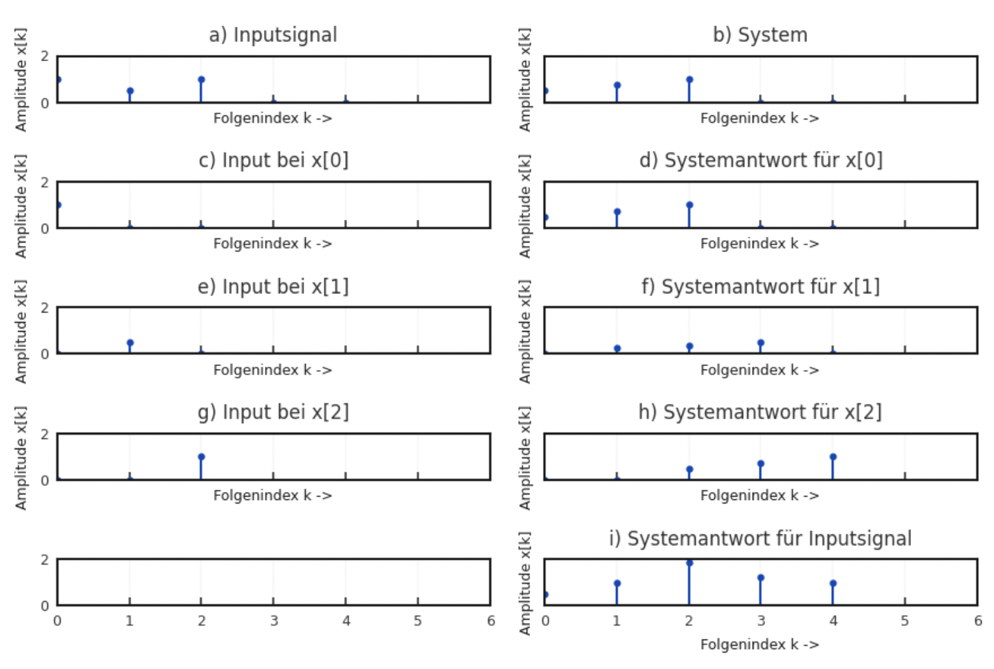 Um dies zu veranschaulichen, ist in Abbildung 3.7 diese Zerlegung für ein Beispiel durchgeführt. Bild a) zeigt die Eingangssfolge x(k) = [1 \space \space 0,5 \space \space 1] , Bild b) das System h = [0,5 \space \space 0,75 \space \space 1] . Zerlegt man nun die Eingangsfolge in drei Einzelimpulse, ergeben sich die drei Bilder c), e), g). Jeder dieser Einzelimpulse erzeugt eine verschobene und gewichtete Version der Impulsantwort (Bilder d), f), h)). Das Ausgangssignal (Bild i)) ergibt sich schlussendlich aus der Summe dieser Ausgangssignale.