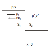 Where v_0 = \frac{p_0}{\rho_0c} and v' = \frac{p'}{\rho_0c} . Introducing the known transmission factor T = \frac{p'}{p_0} , it follows from the above equations that: R = \frac{S_1 - S_2}{S_1 + S_2}