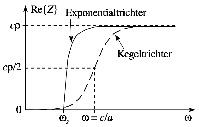 For ω≫ωg, it roughly corresponds to the radiation resistance for a sound source in a sound-hard pipe of cross-section S0. It disappears for ω<ωg. Above its cut-off frequency, the funnel therefore causes a significant increase in the radiation resistance and thus the radiated power. Strictly speaking, all the results in this section only apply to infinitely long funnels, but also approximately to funnels of finite length.