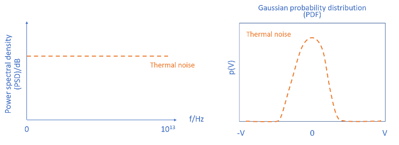 El ruido térmico es frecuentemente caracterizado como ruido blanco Gaussiano debido a que es una combinación de un número muy grande de eventos aleatorios (movimiento aleatorio de electrones). El término se refiere a la distribución pareja de potencial a lo largo del espectro de frecuencia, el cual se asume que es uniforme de 0 Hz hasta 1013 Hz.[Crecraft] La energía del ruido térmico incrementa con la temperatura y el ruido de voltaje varía con el tiempo con distribución de probabilidad gaussiana y un valor promedio de cero. Densidad de espectro del potencial y la distribución de probabilidad gaussiana del ruido térmico.