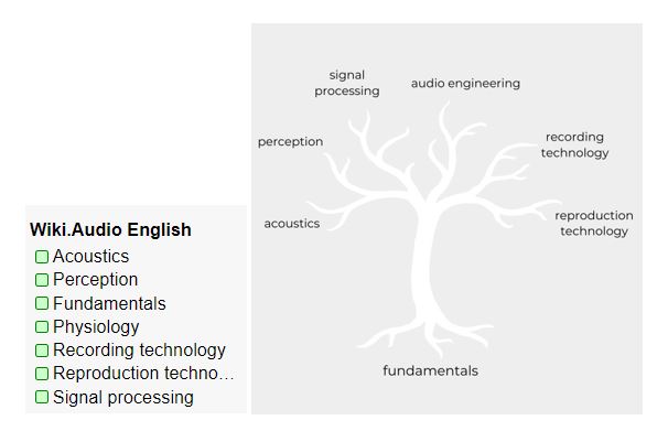 The contents of Wiki.AUDIO are structured tree-like according to the six major topics of audio technology. This structure is reflected in the page tree in the left menu bar. Each of these six main topics branches out into subchapters and finally into individual articles. As an author, you have the option of adding a branch or a leaf in the form of an article at any point in the tree by clicking on "New" in the header or footer. The displayed page can be edited by clicking on "Edit".