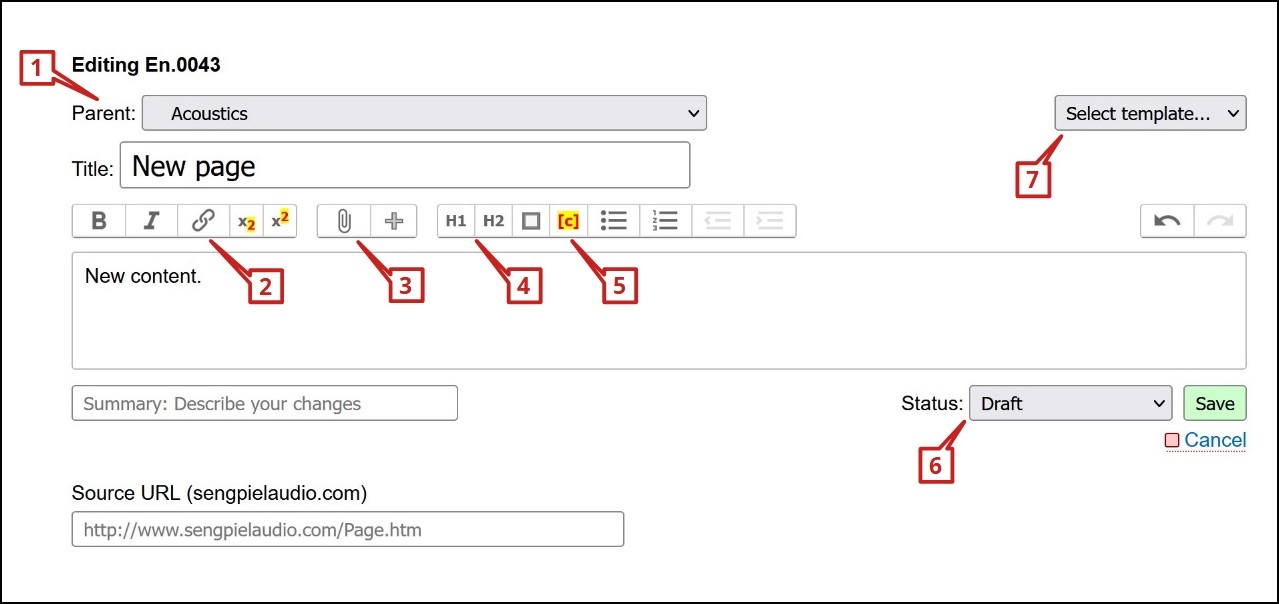 The drop-down menu "Status" [6] is used to select the current progress of the page. If the option "Draft" is selected, the page is publicly visible but clearly marked as a draft. Once the status "Ready for Approval" is set, a wiki.audio editor reviews the article and then sets the status to "Approved". For further information see the section Review process.