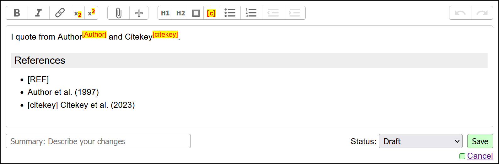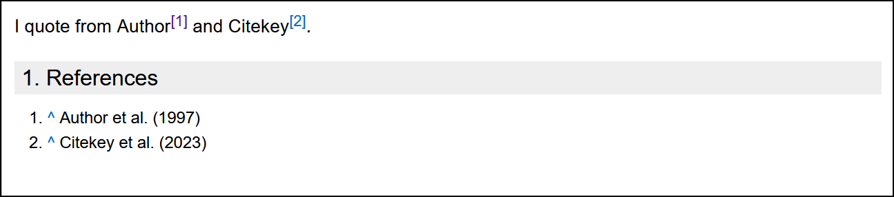 To insert a reference in the text, the "citekey" must be formatted in superscripted square brackets.
